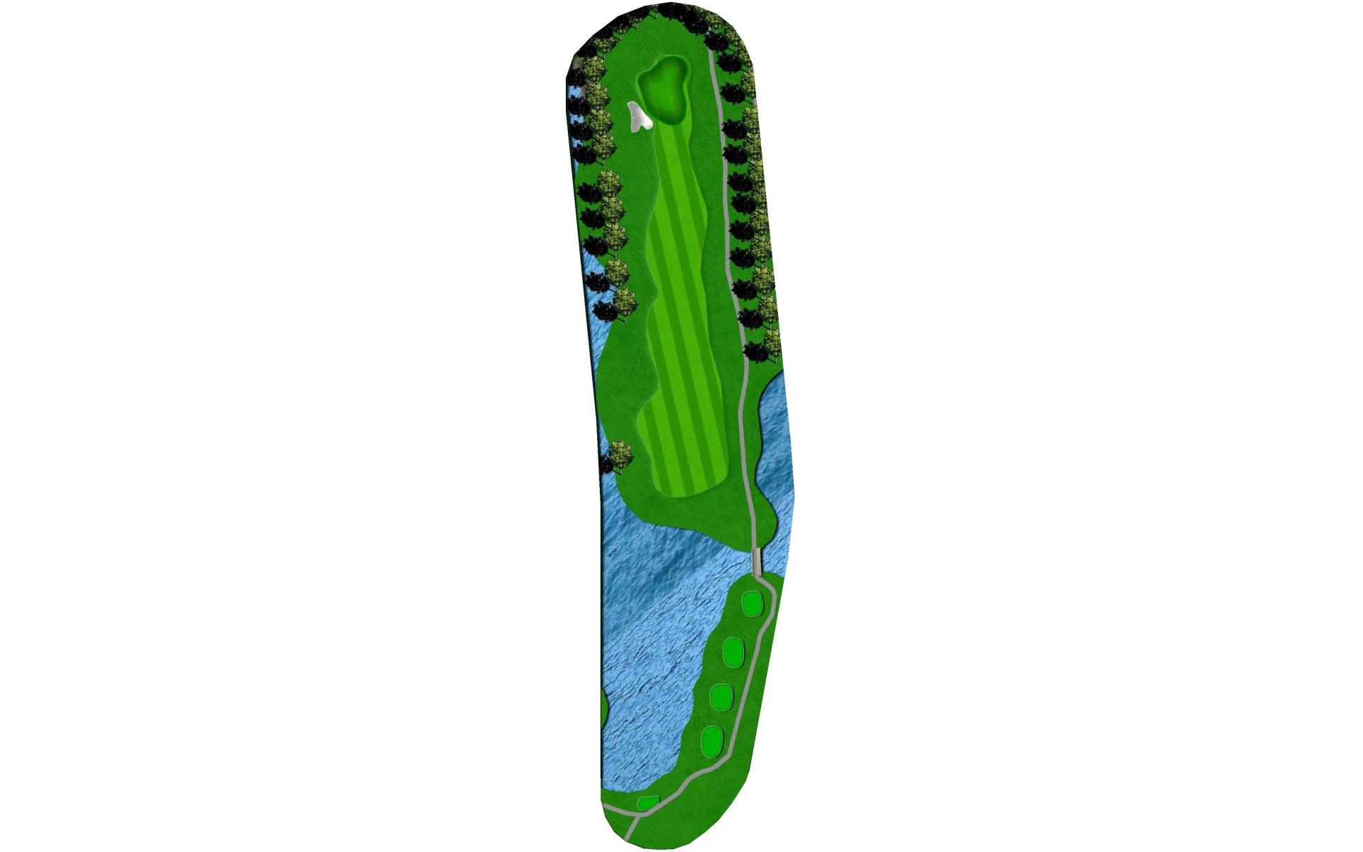 Long hitters can cut off part of the lake’s corner. Keep in mind the wind blows towards the water. Keep ball short of all pin positions.